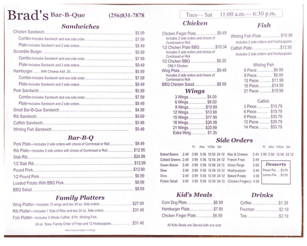 Brad's Bar-B-Que Menu
